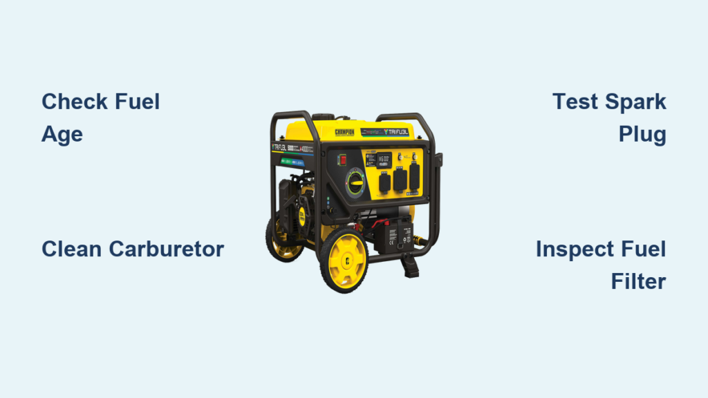 Quick fix: Replace the inline filter (available at any auto parts store) or clean the screen inside the fuel tank using a toothbrush and carb cleaner. Champion generators commonly develop clogged tank screens after months of storage.
