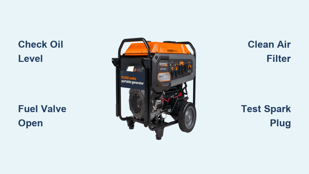 Your Generac portable generator sputters and dies during a critical power outage, leaving you in the dark while appliances sit useless. That frustrating click when you hit the electric start or the pull cord catching nothing isn’t magic—it’s usually one of five preventable failures. Most Generac no-start problems stem from oil, fuel, or air system neglect, and this guide delivers exact steps to diagnose and fix them using only basic tools. Stop guessing why your generator won’t run; follow this sequence to restore power before the storm passes.