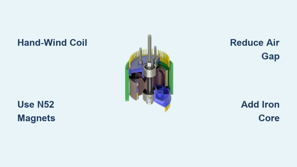 Clamp the coil 1mm from the magnet’s path using calipers. Test by sliding a business card (0.76mm thick) between them—if it fits snugly, you’re in the voltage-boosting zone. Spin by hand: multimeter should show 0.8-1.2V AC at 100 RPM. Troubleshooting: Zero volts? Flip the magnet 180°—you’ve got the polarity backward.