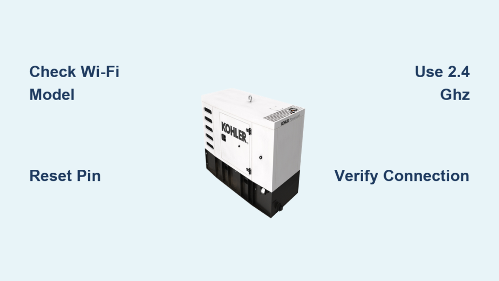 Kohler generators only connect to 2.4 GHz networks—5 GHz bands won’t appear during setup. Test this now: on your phone, disable 5 GHz in router settings or create a dedicated 2.4 GHz guest network. Keep your phone within 10 feet of the generator during setup; weak signals cause 70% of failed connections. Pro Tip: Write down your Wi-Fi password before starting—typing it on the generator keypad wastes time.